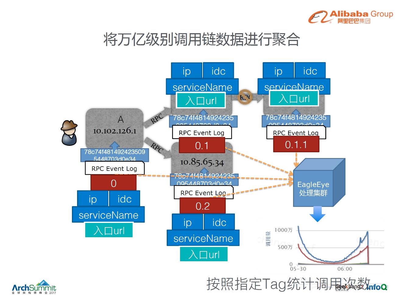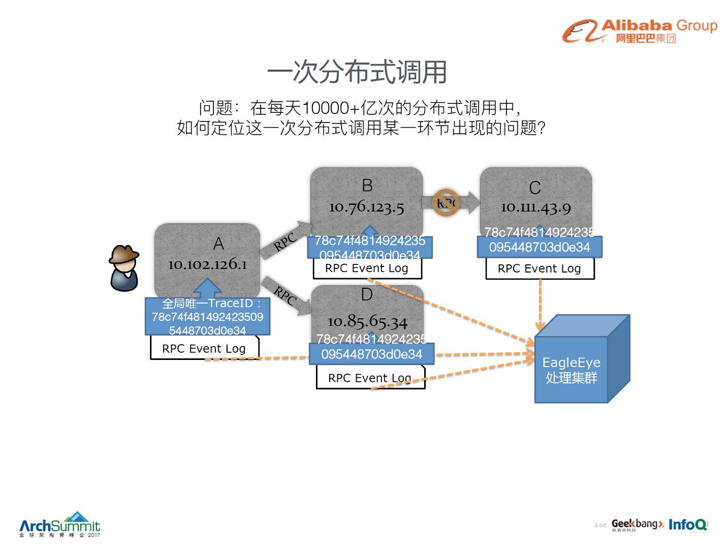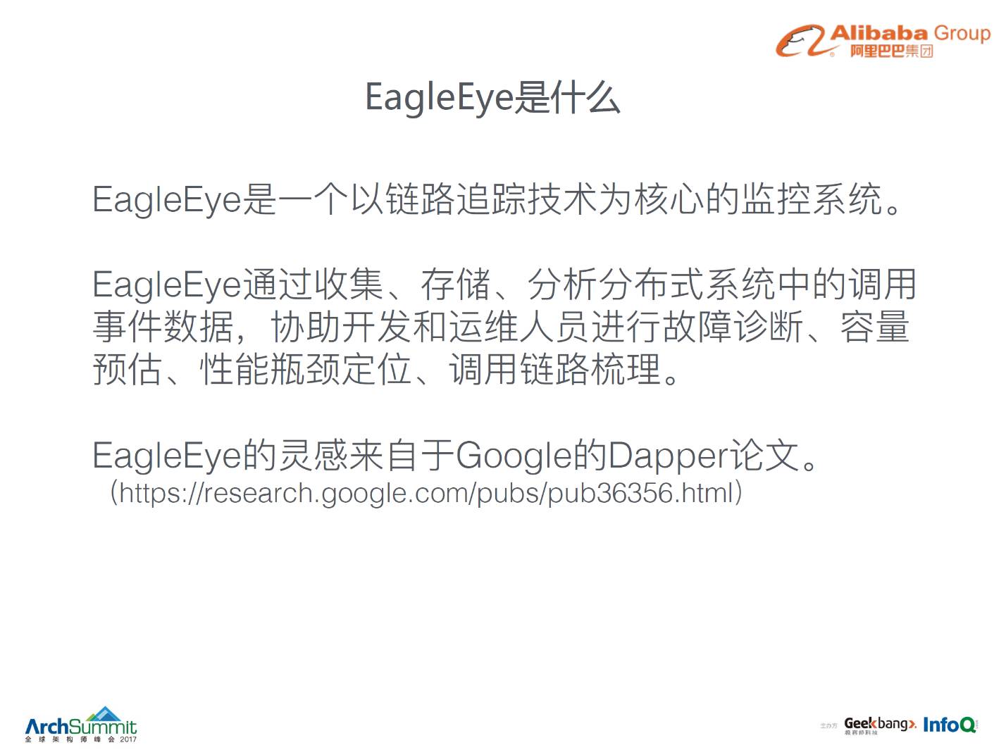 本文分为三个部分,第一个是阿里巴巴的分布式追踪系统,也就是鹰眼系统的技术实现原理、基础功能以及在阿里的使用场景。第二个想和大家分享一下这套系统背后的一些技术细节,包括流计算,存储的架构演进,我们踩过的一些坑、技术层面一些优化是什么样的,也会分享一下我们是如何对监控系统进行模块化改造的。第三个就是我们如何把一个被动的监控系统转成一个主动发现问题的系统,这一块我们其实也是在做初步的尝试和探索,在做的过程中也希望跟大家一起分享,抛砖引玉,交流一下经验。