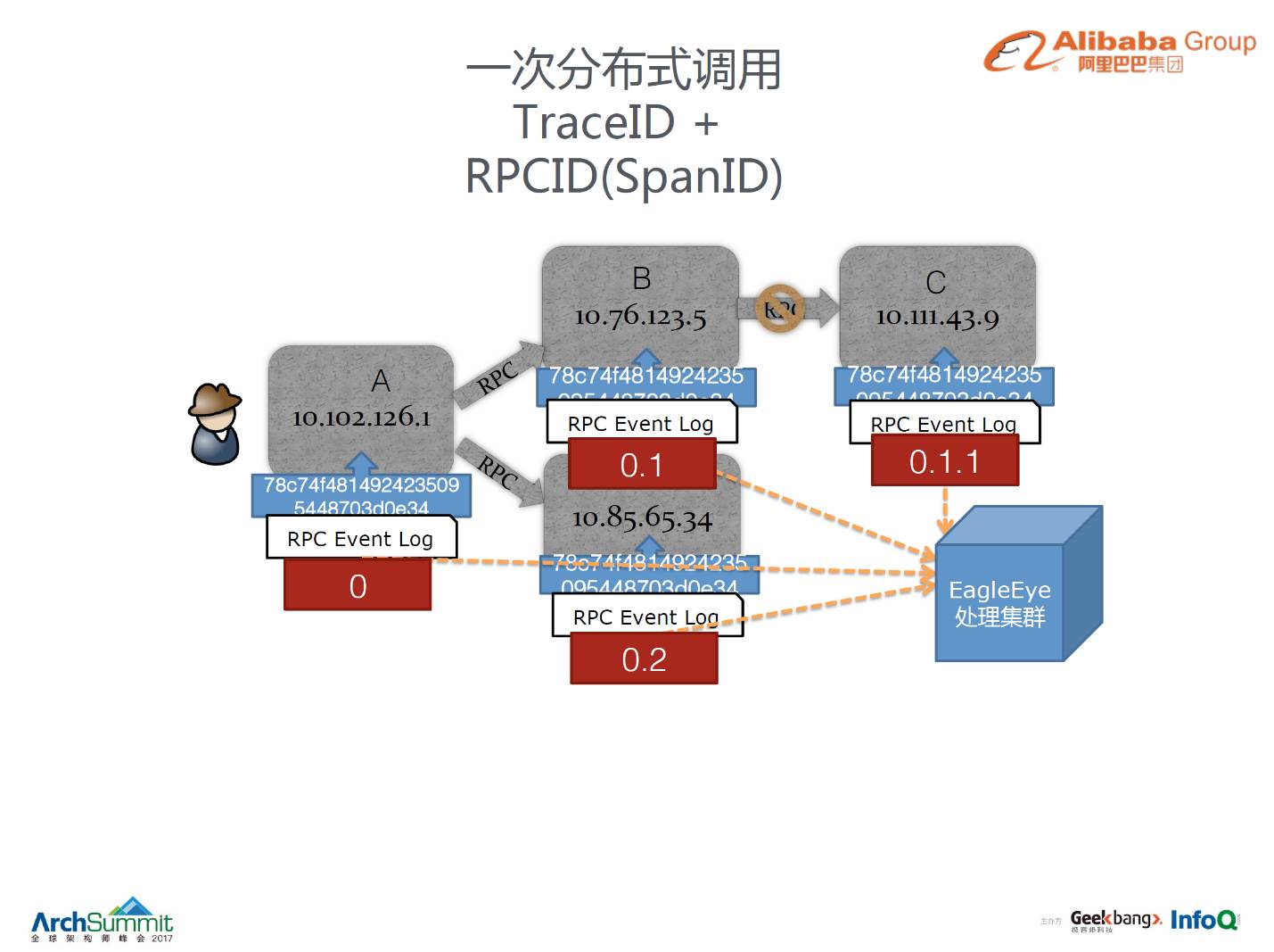 要想还原调用堆栈,我们还需要另外一个东西叫做 RPCId(在 OpenTracing 中有类似的概念,叫做 SpanID),RPCId 是一个多维序列。它经过第一次链路的时候初始值是 0,它每进行一次深入调用的时候就变成 0.1,然后再升就是 0.1.1,它每进行一次同深度的调用,就是说 A 调完 B 以后又调了 D 就会变成 0.2,RPCId 也随着本次调用被打印至同一份 RPC Log 中,连同调用事件本身和 TraceId 一起被采集到中心处理集群中一起处理。