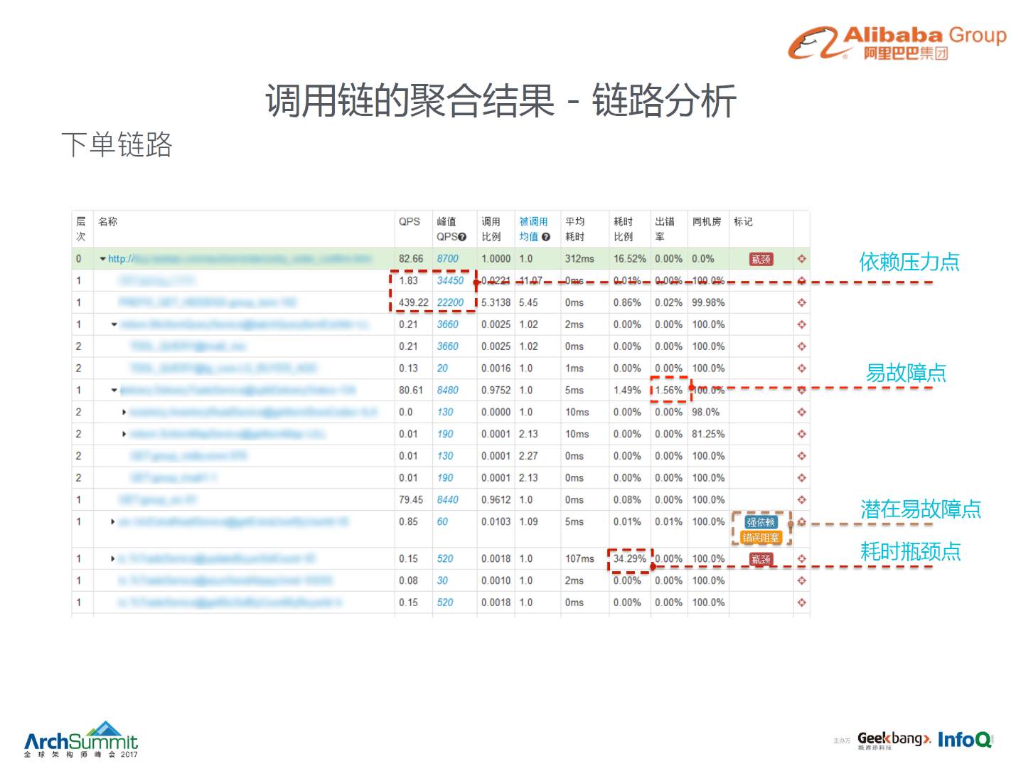 这是真实的我们系统当中的下单链路聚合结果图。除了我刚才说的一些点,我们还可以获得一些什么呢?比如说易故障点,也就是说这个系统看上去大面上没什么问题,但是偶尔它会出一些小问题。为什么我们说是易故障点,因为一旦它出现问题,下游的链路就终止了,也就是说调用对下游系统其实是强依赖的关系,那我们可以认为这个链路如果有一天下游系统真的挂了,那么整条链路的稳定性很可能出现问题,我们可以根据这些数据帮助用户提前发现这些潜在的问题。