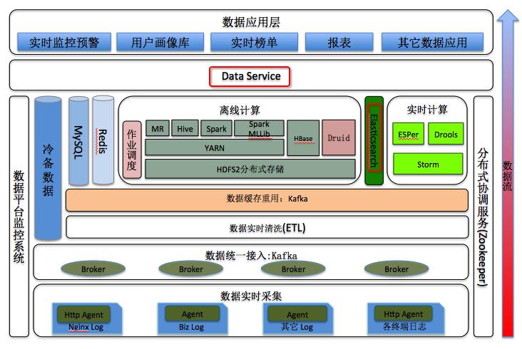 从这张图中,可以了解到大数据处理过程可以分为数据源、数据接入、数据清洗、数据缓存、存储计算、数据服务、数据消费等环节,每个环节都有具有高可用性、可扩展性等特性,都为下一个节点更好的服务打下基础。整个数据流过程都被数据质量监控系统监控,数据异常自动预警、告警。