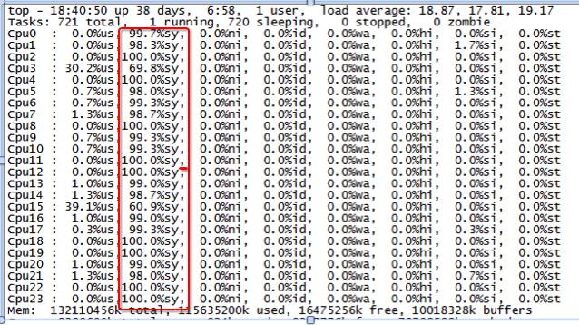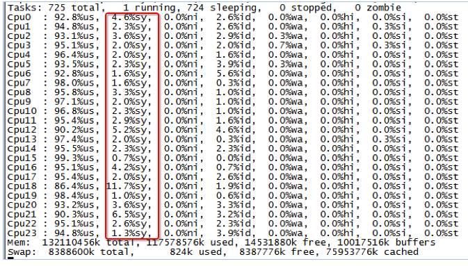 Hadoop的I/O性能很大程度上依赖于Linux本地文件系统的读写性能。Linux中有多种文件系统可供选择,比如ext3和ext4,不同的文件系统性能有一定的差别。我们主要想利用ext4文件系统的特性,由于之前的操作系统都是CentOS5.9不支持ext4文件格式,所以考虑操作系统升级为CentOS6.3版本,部署Hadoop集群后,作业一启动,就出现CPU内核过高的问题。如下图: