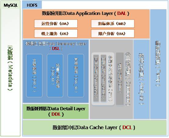 大数据平台数据存储模型分为:数据缓冲层Data Cache Layer(DCL)、数据明细层Data Detail Layer(DDL)、公共数据层(Common)、数据汇总层Data Summary Layer(DSL)、数据应用层Data Application Layer(DAL)、数据分析层(Analysis)、临时提数层(Temp)。